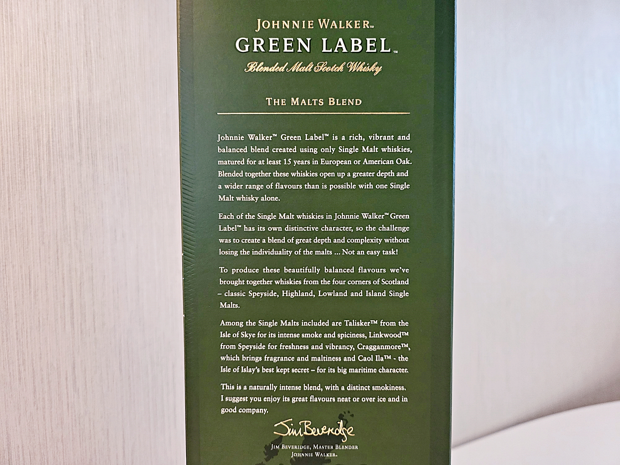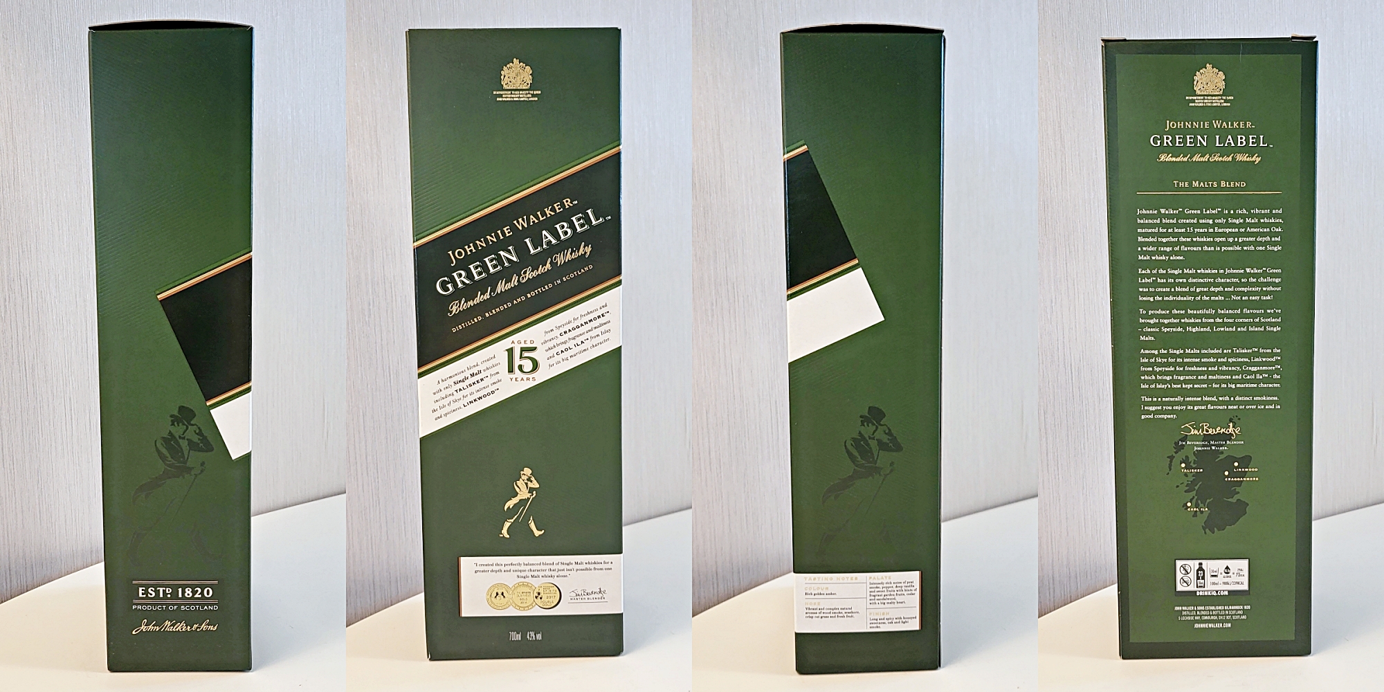 Each of the Single Malt whiskies in Johnnie Walker Green Label has its own distinctive character, so the challenge was to create a blend of great depth and complexity without losing the individuality of the malts... Not an easy task!