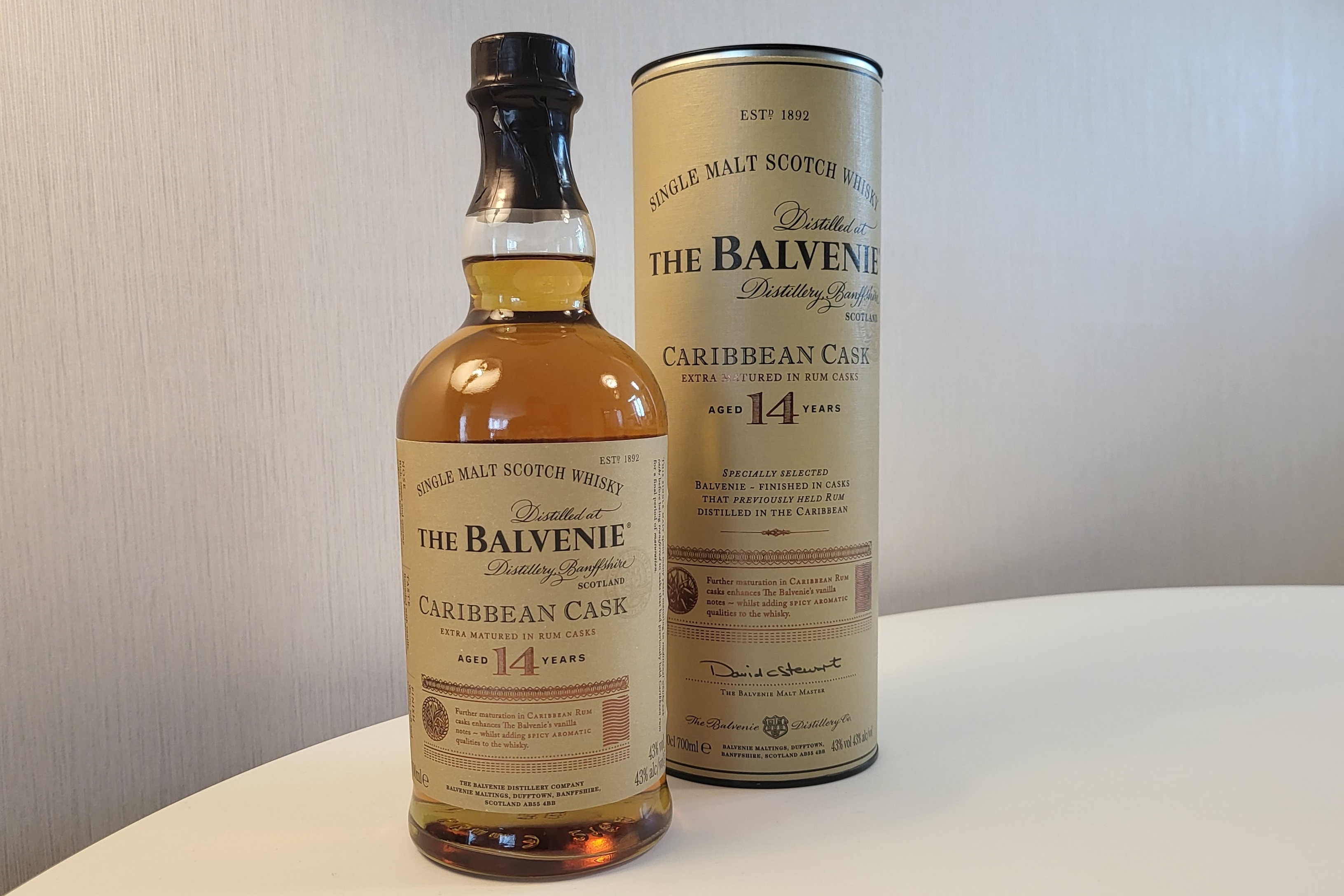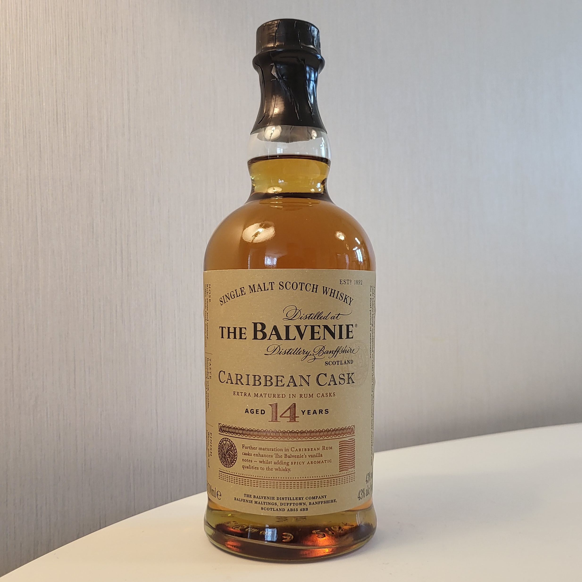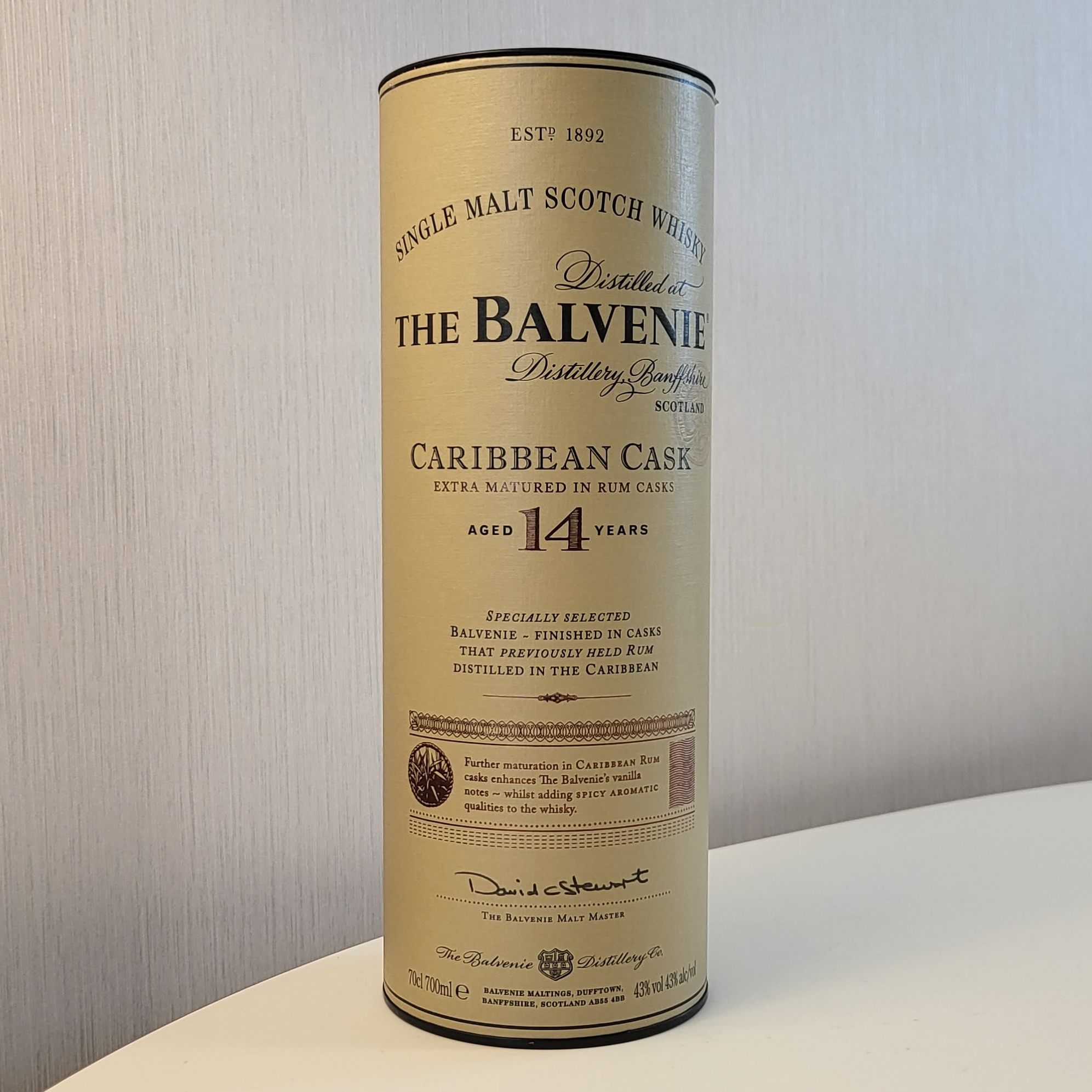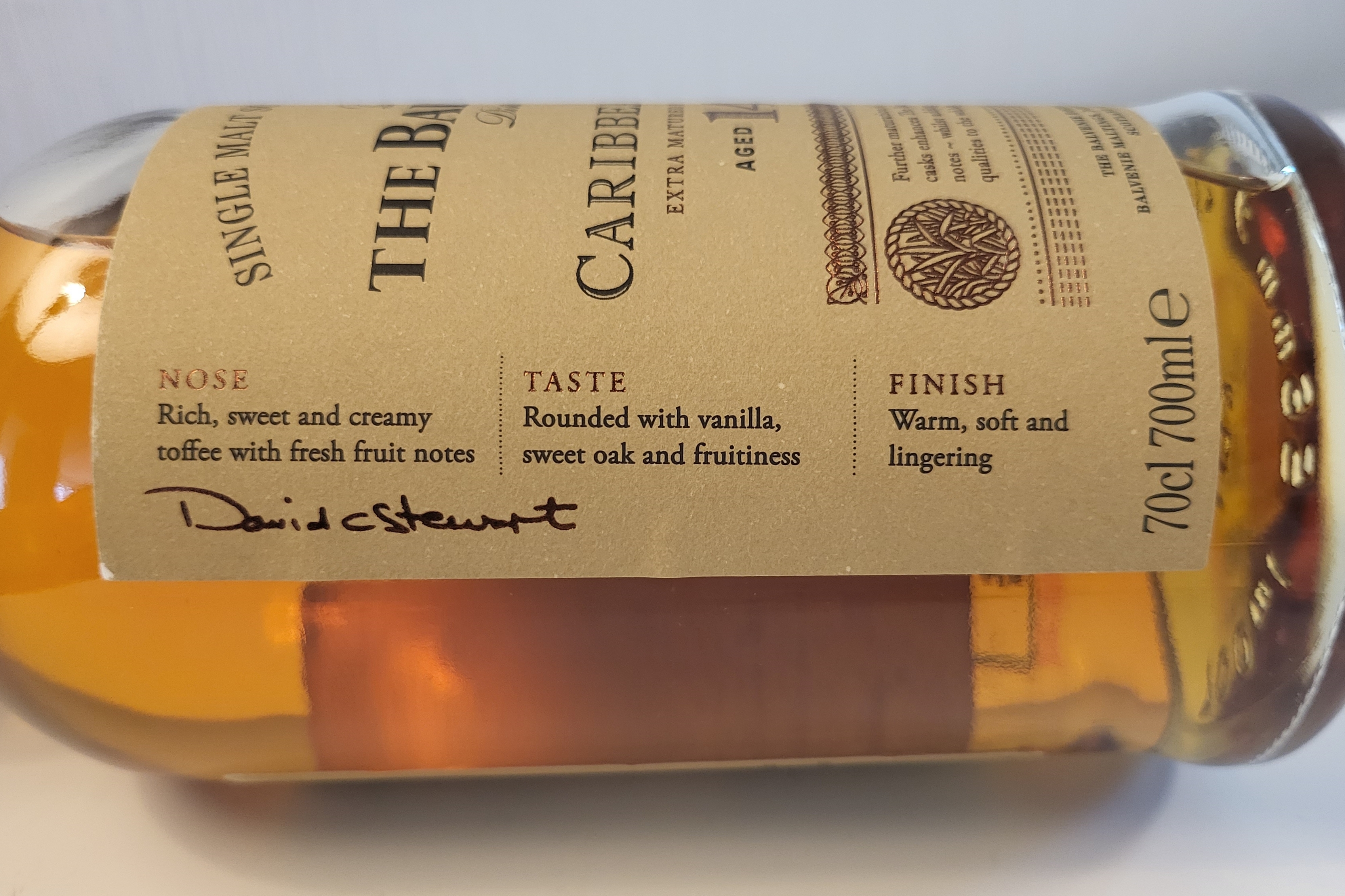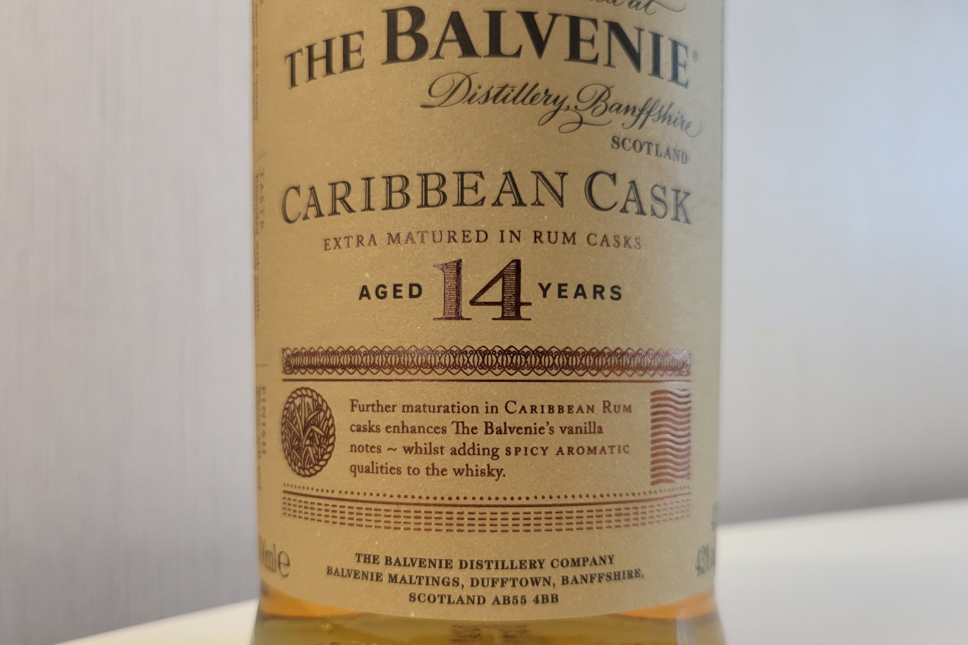 The Balvenie Caribbean Cask 14 year old single malt whisky has been matured in traditional oak whisky casks for 14 years, and then ‘finished’ in casks that previously held Caribbean rum.