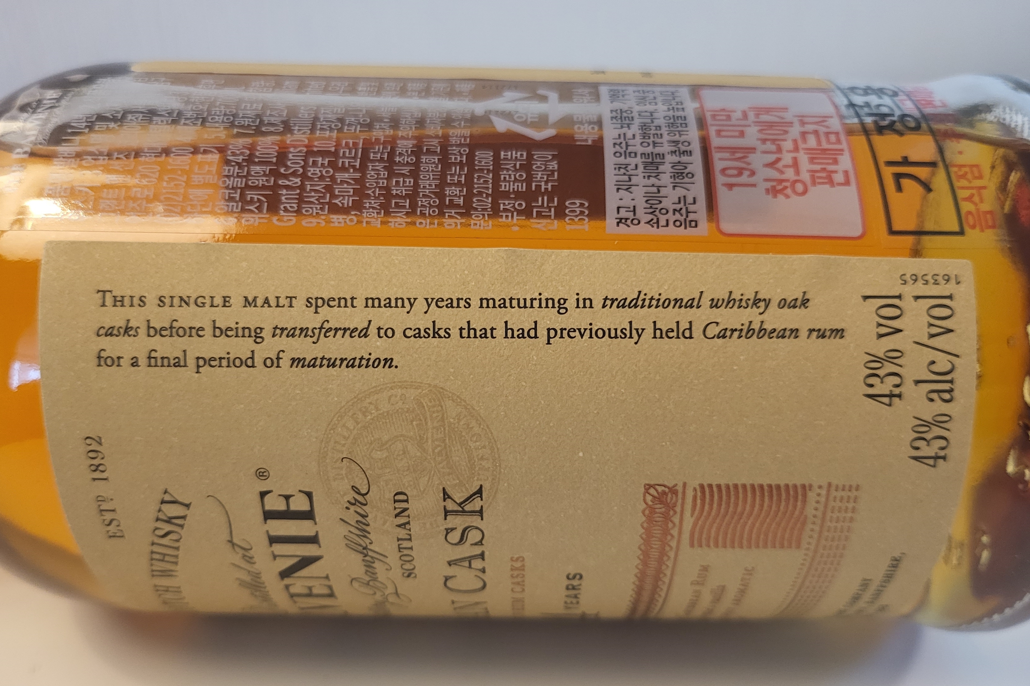 전면 라벨지에 기재된 설명에는 캐리비안 럼 캐스크 숙성을 통해 바닐라 향을 강화시켜주고, 위스키에 스파이시함을 더해주었다고 합니다.