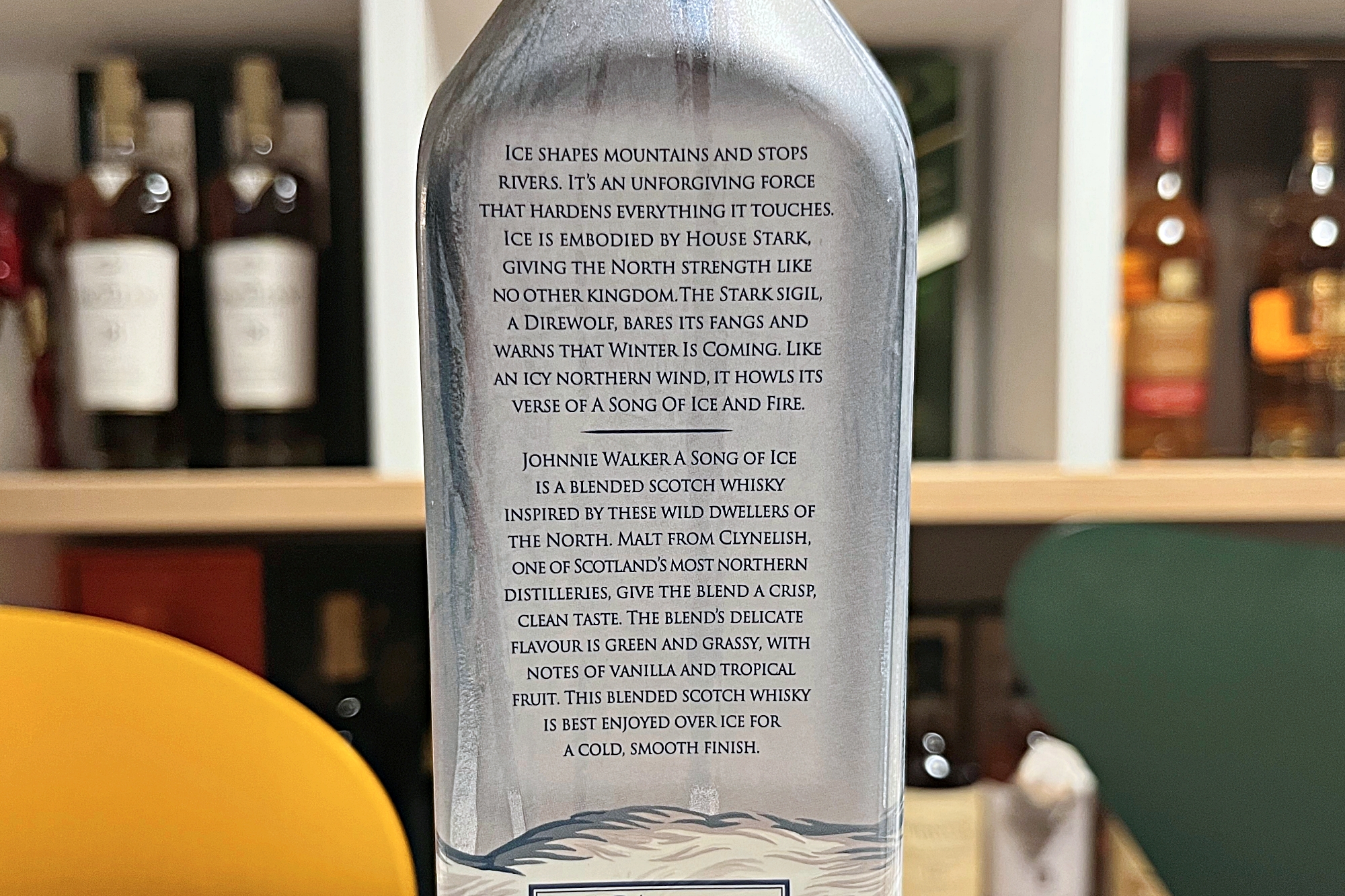 JOHNNIE WALKER A SONG OF ICE is a blended scotch whisky inspired by these wild dwellers of the north. Malt from CLYNELISH, one of scotland's most northern distilleries, give the blend a crisp, clean taste. The blend's delicate flavour is green and grassy, with notes of vanilla and tropical fruit. this blended scotch whisky is best enjoyed over ice for a cold, smooth finish.