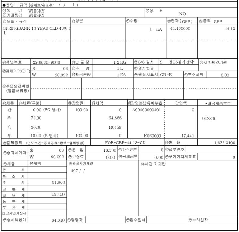 수입신고서 및 관부가세 계산