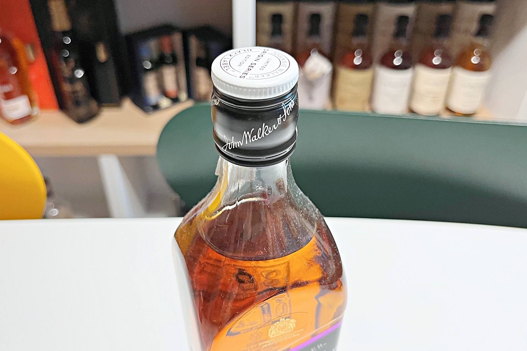 조니 워커 블랙 라벨 스페이사이드 오리진 제품의 병은 보라색을 포인트로 사용한 것이 특징입니다.